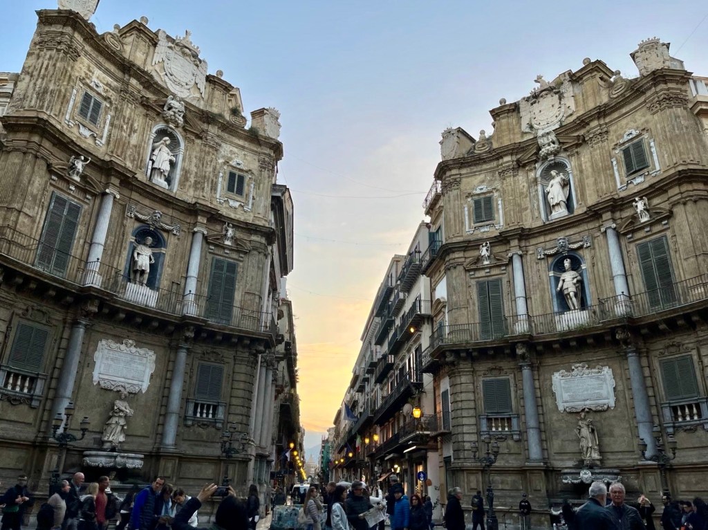 Four Conners is the intersection of two major pedestrian streets, and is the center of activities in Palermo. Each corner stands a heavily decorated Baroque building with fountains, statues, balconies. It is lively and crowded. Live music and street artists of all sorts tend to perform here. Open air markets, restaurants, museums, libraries are either on the street or close by. Our vacation rental was nearby. So we come here at twilight almost every evening to eat, to stroll, to feel the vibe, and to see people and the ornate building facades.