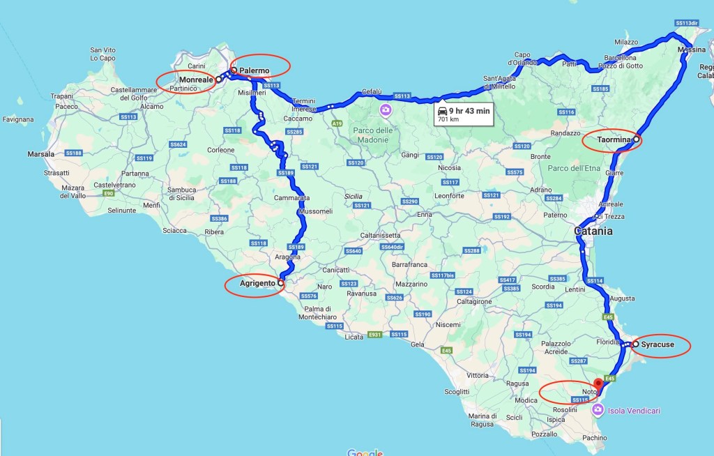 We flew to Palermo, took a train to Taormina, then to Syracuse, then a bus from there to the Catania International Airport to depart from Sicily. The whole trip was about 11 days. We had 3 stops and spent about 3 full days on each stop: Palermo, Taormina, and Syracuse. We took 3 day trips: a day trip to Monreale by bus and a day trip to Agrigento by train from Palermo, and a day trip to Noto by train from Syracuse.