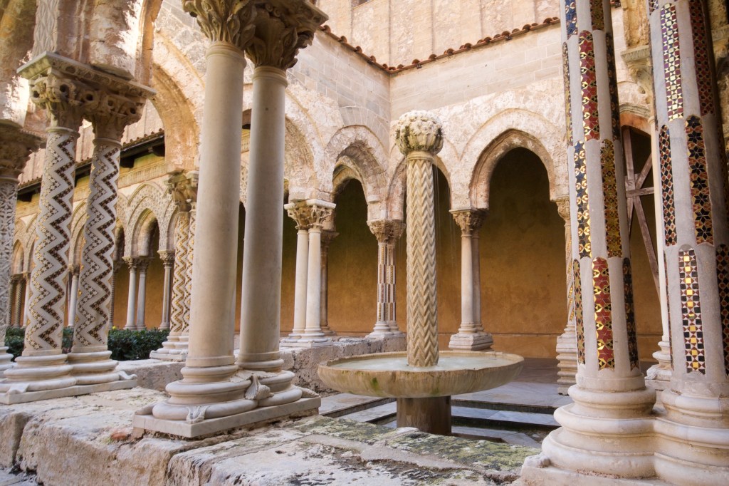 Monreale is a small hill top town about a half hour bus ride from Palermo. It is known for the basilica and its cloister, mosaic art, and the roof top terrace. The basilica is in typical Norman style, with two beefy square bell towers at one end. It is best known for two things, the Byzantine style mosaic wall art that depicts Noah’s Arc stories, and the cloister in its attached monastery. The mosaic art rivals any Byzantine mosaic artifacts that I’ve seen. The cloister is influenced by Arab style. The columns are slim compared to Greek and Roman columns. The columns and capitals are either inlaid with glistening geometrically patterned glass or carved with bible stories with vivid figurines such as Adam and Eve. The details in these columns and capitals are shockingly elaborate.