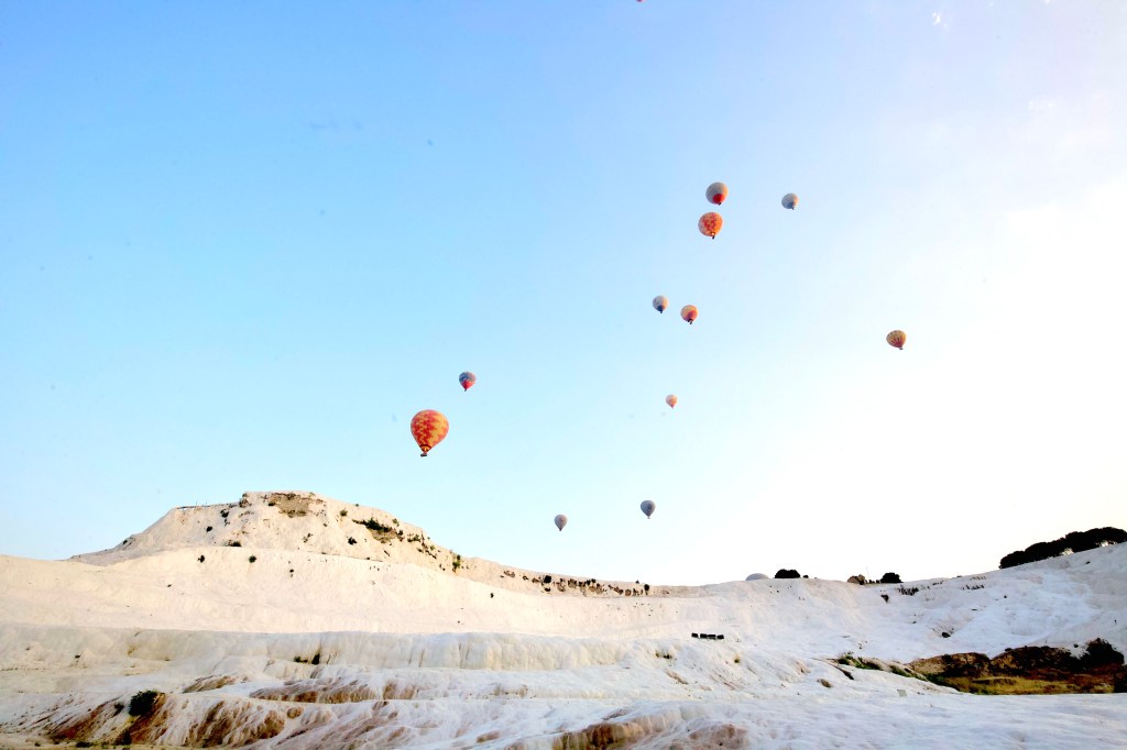 What does Turkey invoke in people’s minds? I grew up in a time pre-hot air balloon tourism and the image I associated with Turkey was Cotton Castle – Pamukkale in Turkish. It is one of the most photographed objects in Turkey – white travertine terraces interleave, hot spring water flows over the terraces forming shallow turquoise pools. The ancient Romans loved to bathe and believed the hot spring had healing properties. They built the city Hierapolis next to the travertine pools. Legend has it that Cleopatra bathed there. She was the Queen of Egypt, wife of Caesar, after his assasination, wife of Mark Anothony (Consul of Rome). Cleopetra’s Pool is one of the biggest attractions here.