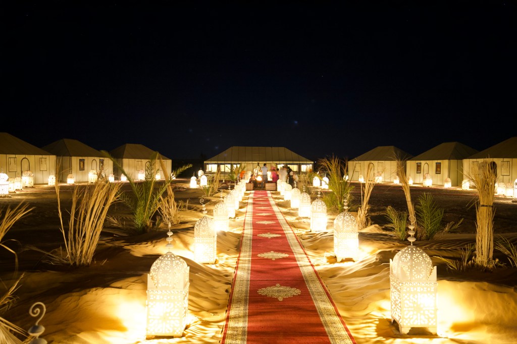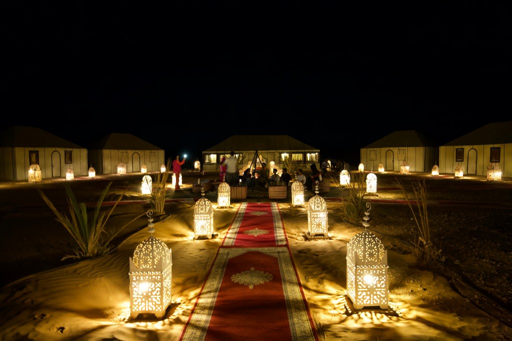 Everything was timed perfectly. We went back to the camp under star light, thanks to the guide and the camels for the navigation. Our camp was a 7-tent complex connected by rugs and illuminated by traditional lamps, with a camp fire at the center of the complex. The tents were actually spacious luxury suits with beds, a bathroom and shower made of canvas anchored on sand. The large middle tent was a feast hall. A sit-down multi-course feast was served under the large tent, followed by live traditional music around the camp fire under the starry sky, and everybody danced around it, cel ebrating this unique place and experience.