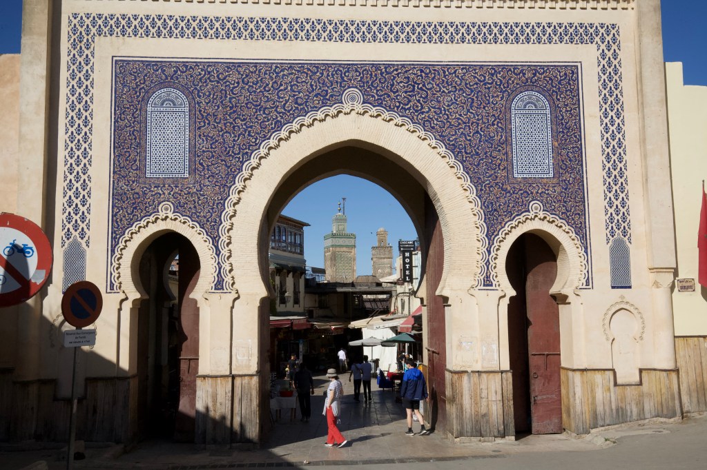 Fez was the biggest of the imperial cities (former capitals) in Morocco. Its old city was massive and had extensive souk districts, less rowdy than Marrakech. Our travel guide arranged for us a local guide, an Arabic lady (both our driver and travel guide were Berbers) who lived in Fez. We visited the Jewish district where many Jews left for Israel over time. A vibrant jewelry street still thrived in the district. A hands-on experience was at a ceramic workshop where my son operated a turn table and made a crude pot under a craftsman’s guidance. A few craftsmen were chipping ceramic tiles to make traditional fountains by arranging the pieces into decorative patterns. The Muslim religion doesn’t promote human images, instead, uses geometric patterns for decoration. The owner told us that the English word “algebra” came from Arabic “al-jabr” meaning reuniting the broken pieces. One of the top attractions in Fez, the Blue Gate, is a prime example of the exquisite art of rearrangement of the broken ceramic pieces on a large scale of an imperial city gate.