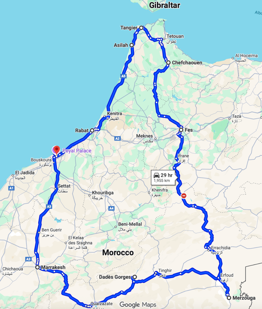 We flew to Morocco in early June 2021, just before it got too hot in the desert, arriving in and departing from the Casablanca International Airport. Our night stays were household destinations: Marrakesh, Dades Gorge, Sahara Desert, Fes, Chefchaouen, Asilah, and Rabat. We also made day trips to Casablanca, Ait ben Haddou castle, Todga Gorge, Meknes, Volupolis, Tangier, and Cape Spartel.